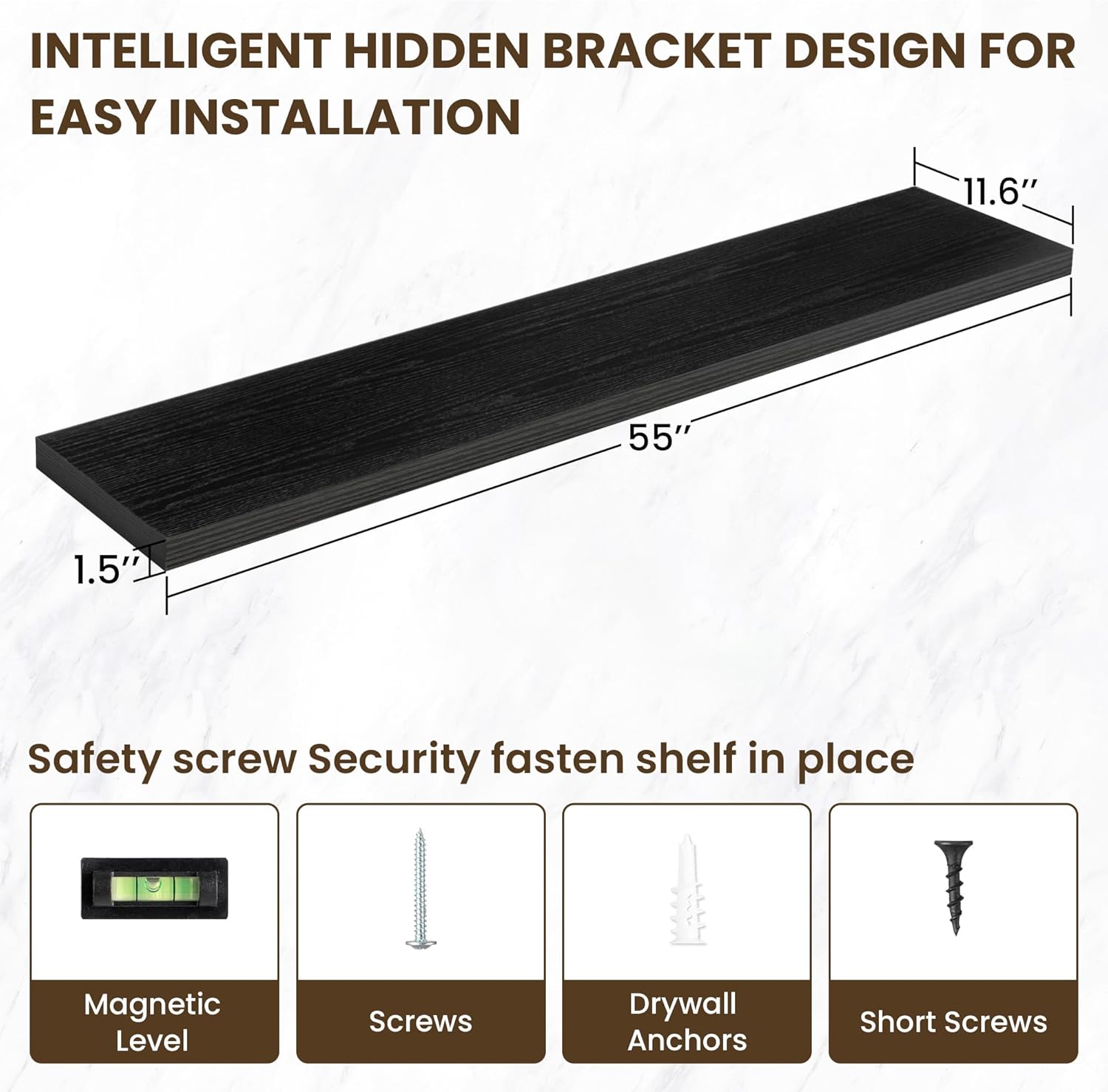 55 Inch Floating Shelves, 11.6 Inch Deep Floating Shelves for Wall, Floating Shelf with Invisible Brackets, Deep Shelves for Bathroom, Bedroom, Living Room, 1 Pack, Black
