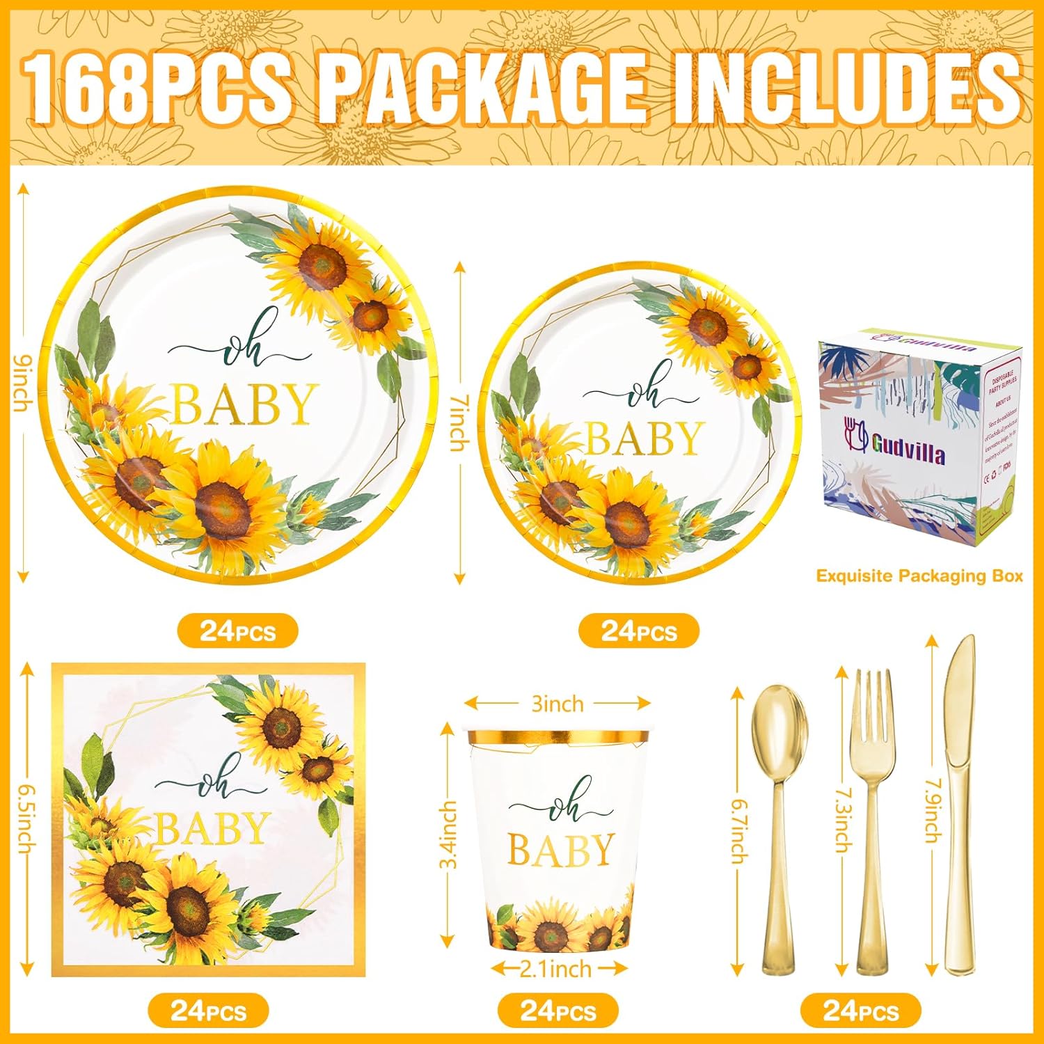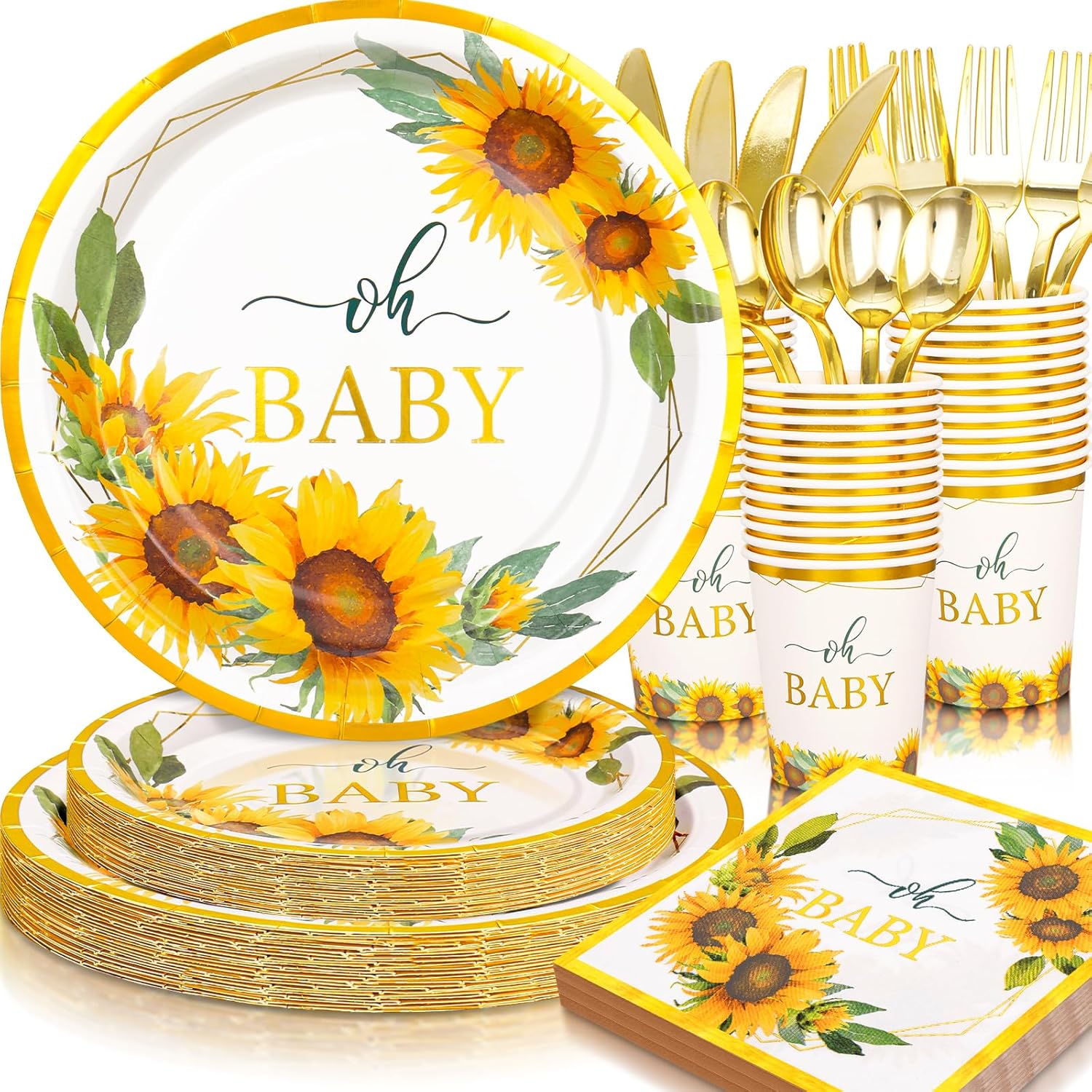- 【Sunflower Party Decorations】- Sunflower plates and napkins party supplies include 24 9 inch sunflower paper plates, 24 7-inch oh baby plates, 24 baby shower cups, 24 baby shower napkins, 24 sets of plastic utensils (forks, spoons, knives)168 pieces in total. This is a great girl baby shower decorations.