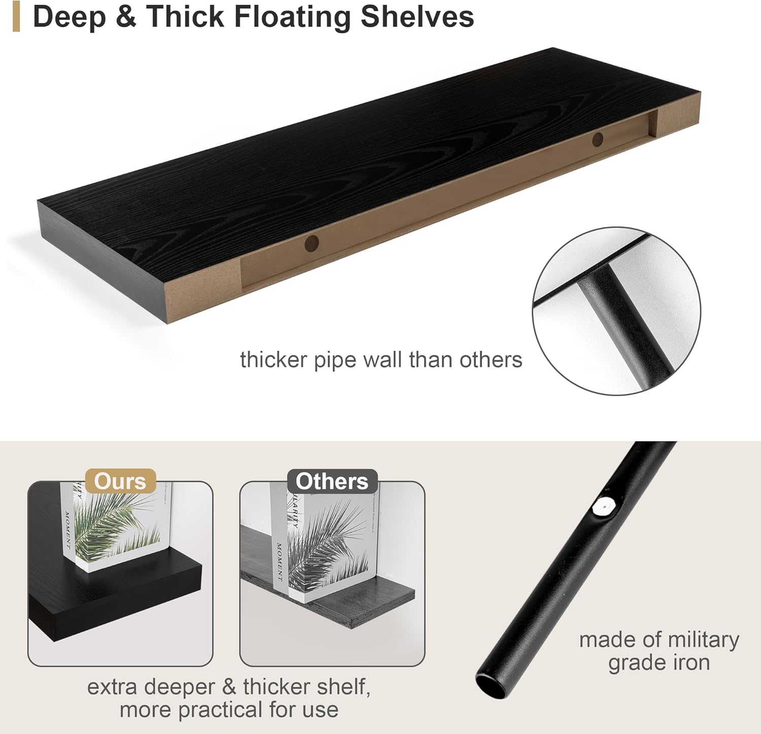 - NOTE:Slight color differences may occur due to lighting and screen settings.Our Well-designed floating shelves for wall are made of MDF Laminate. Slight color differences may occur due to lighting and screen settings.We use a natural wood grain veneer technique so that the veneer on each laminate is unique, so each board has a unique natural wood grain and colour.