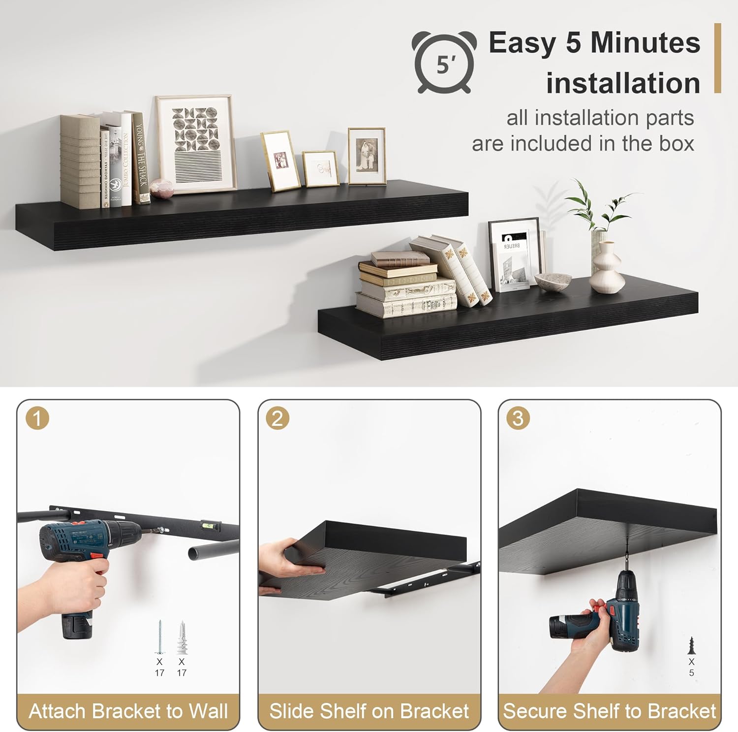 - Sturdy and Easy to install: Includes all necessary hardware to make these floating shelves extremely easy to assemble. We also provide you with detailed install instructions for you to install the shelves in a few minutes.If you’re looking for an easy way to add some functional style to your room, It highly recommend definitely recommend giving these a try!
