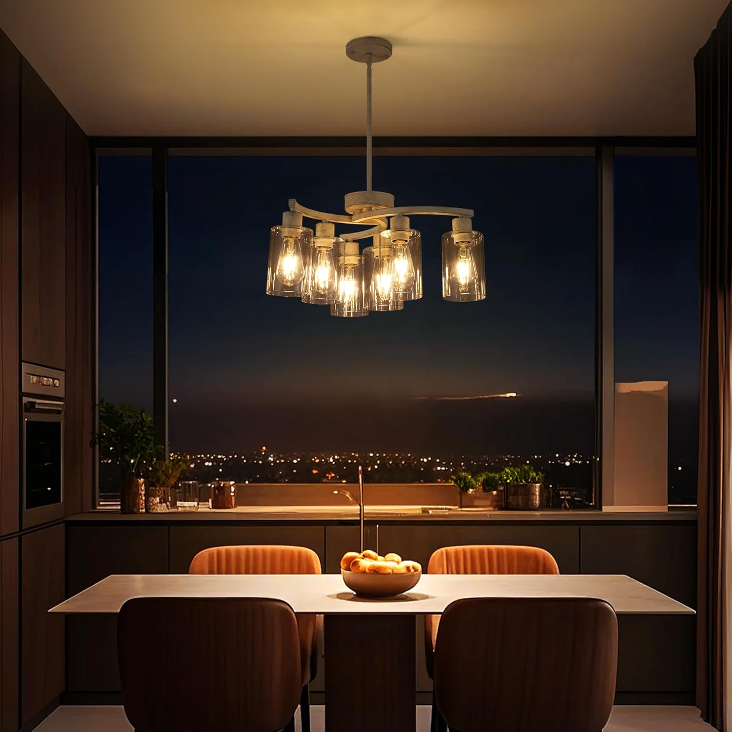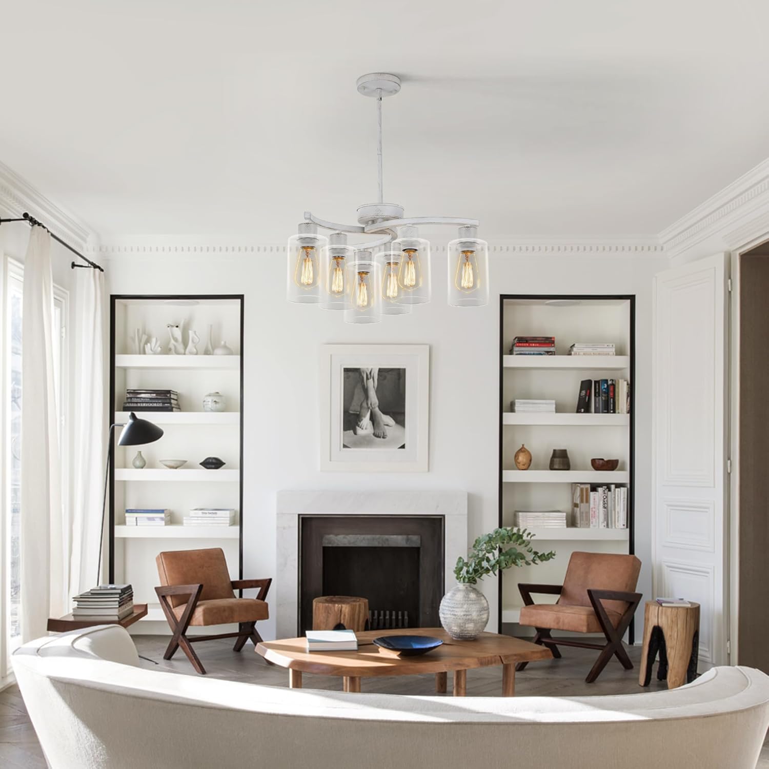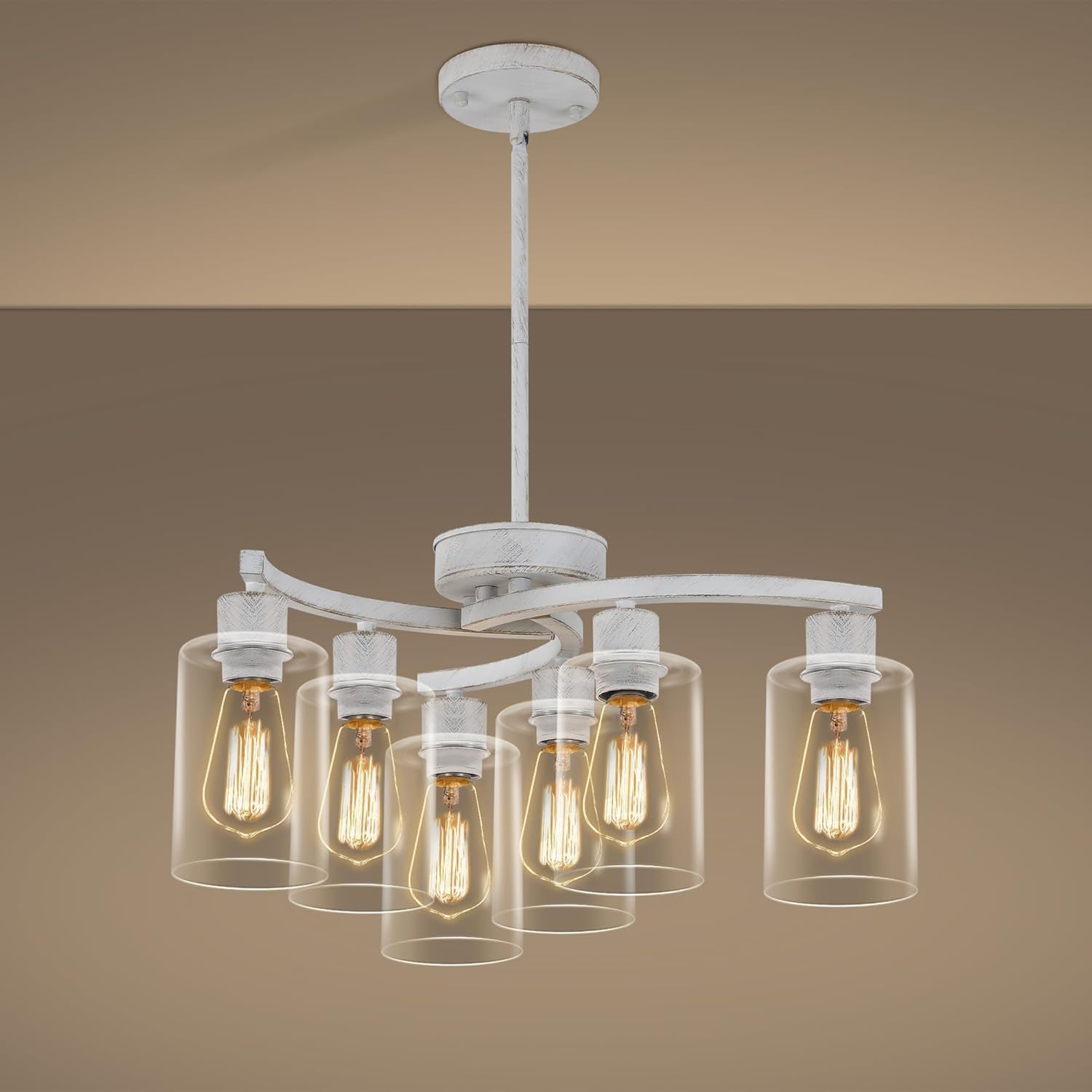 6-Light Antique White Chandelier with Clear Glass Shade, French Country Chandeliers for Dining Room, Adjustable Height Hanging Farmhouse Pendant Lighting for Kitchen Island Entryway Office