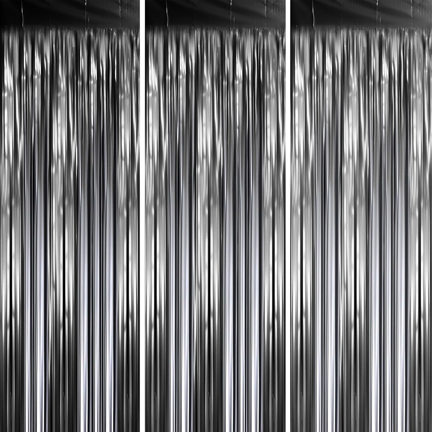 3 Pack 3.3 x 8.2 ft Matte Black Foil Fringe Backdrop Curtains,Gray Tinsel Streamers Party Decorations, Fringe Backdrop, Door Shimmer for New Years, Halloween, Black Theme Party
