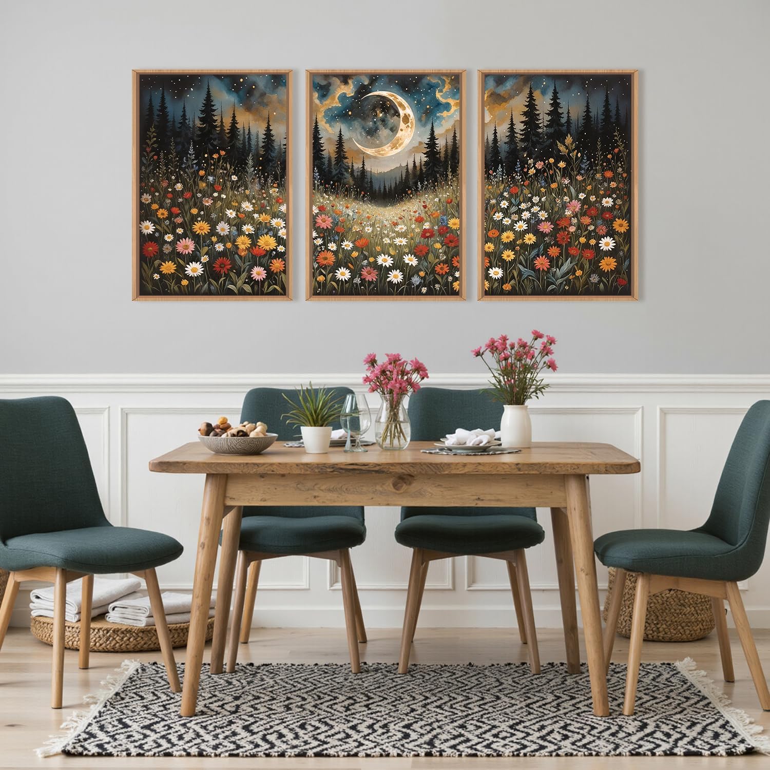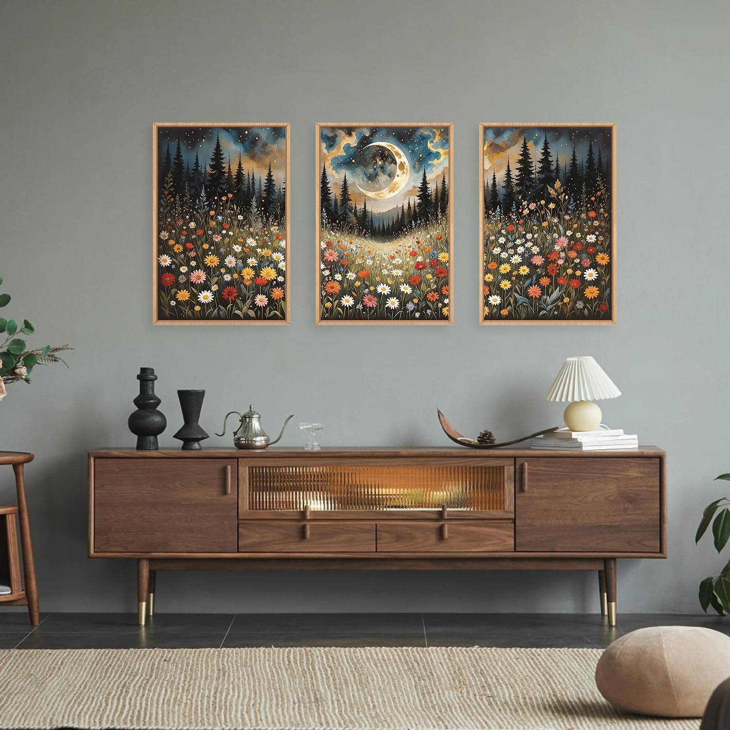 HPINUB Wildflower Moon Pine Tree Framed Canvas Wall Art Set,Nature Forest Wall Decor,Mystical Starry Night Artwork Rustic Mountain Landscape Art Print for Living Room,Bedroom,Office-24 x36 x3