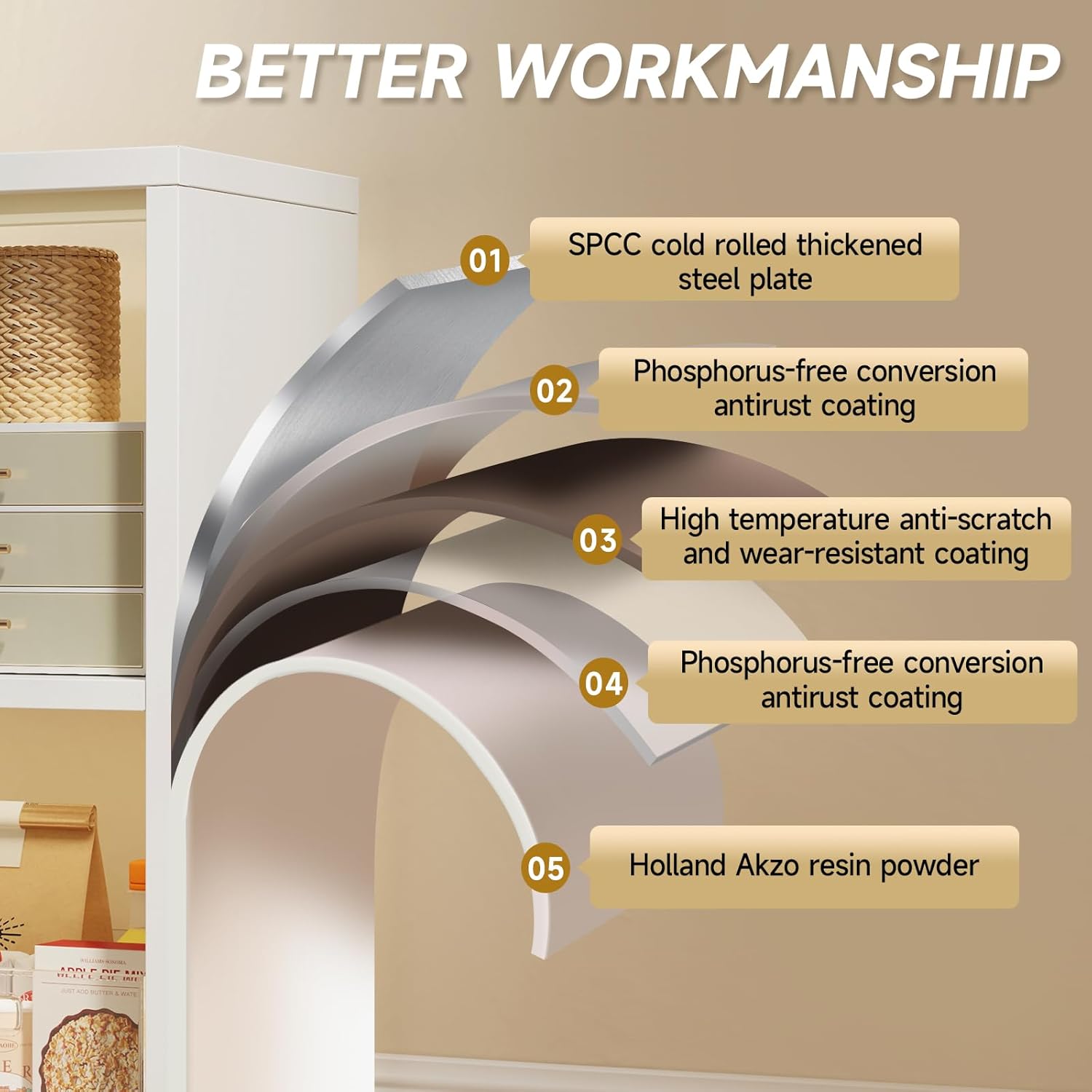 - Sturdy Steel Construction:Made with 0.7mm premium cold-rolled steel for enhanced durability, resistant to deformation. Features anti-tipping stability and adjustable feet to balance uneven floors while protecting surfaces. Sleek, screw-free design ensures a smooth, modern aesthetic