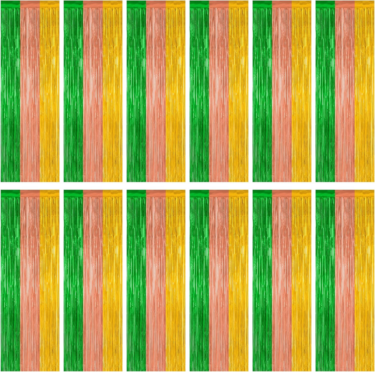 12 Pack Hawaiian Party Decorations, 3.28 FT x 7.05 FT Luau Party Decorations, Green Brown Yellow Luau Backdrop Fringe Curtains Foil Streamer, Metallic Summer Decor Luau Party Supplies
