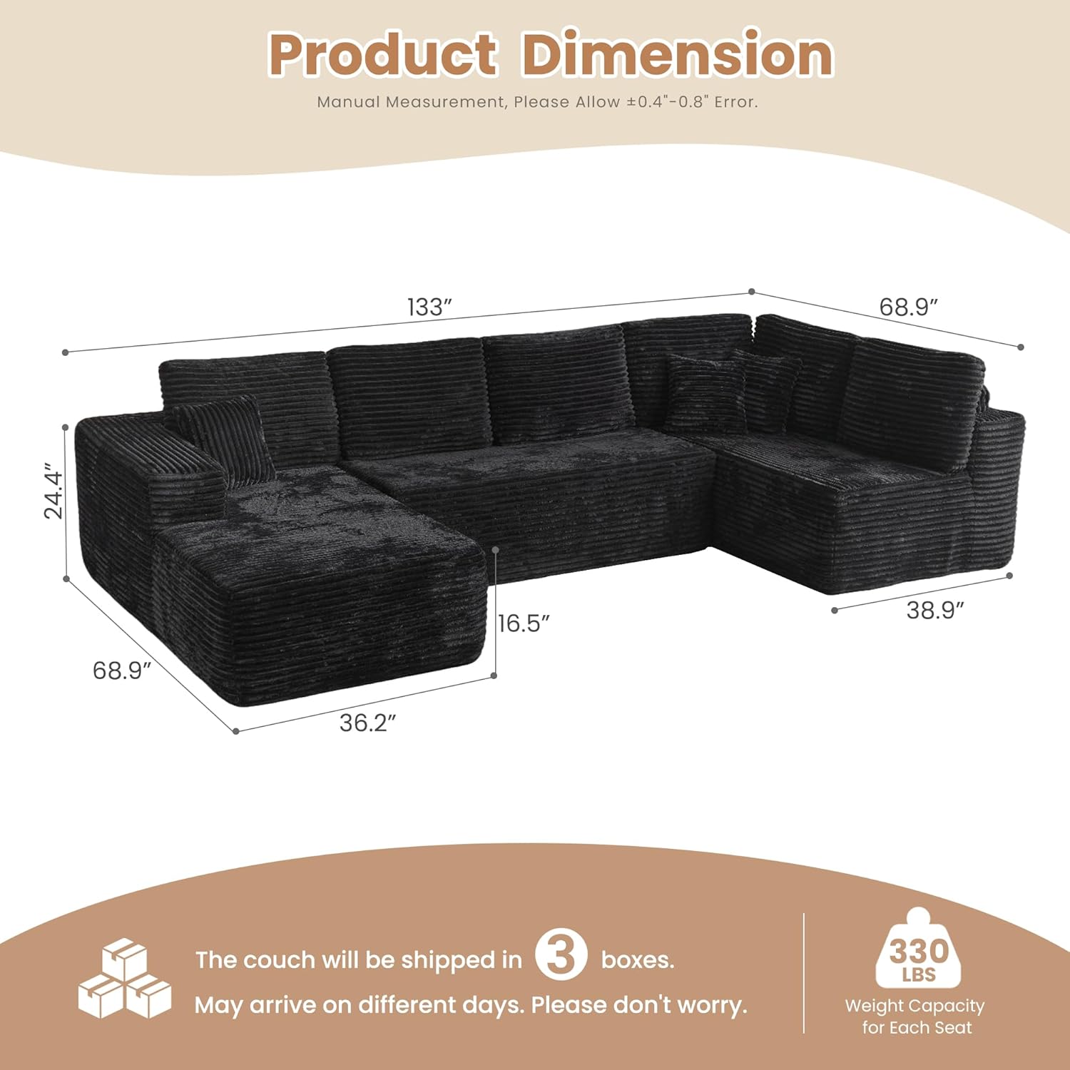 HOOOWOOO Cloud Sectional Couches for Living Room,Modular Sectional Sofa No Assembly,133X70 Inch Plush Corduroy Large U Shaped Floor Couch Set with Deep Seat Chaise Lounge(Black)