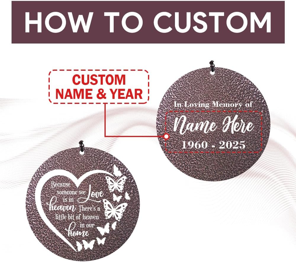 - 🎐Personalized Wind Chimes: With heart butterfly and some words like "Because someone we love is in heaven, there's a little bit of heaven in our home" on the one side of catcher, another side of catcher is customized the name&date you want. It provides peace and comfort to a grieving friend who has lost a loved ones such as parents and so on.