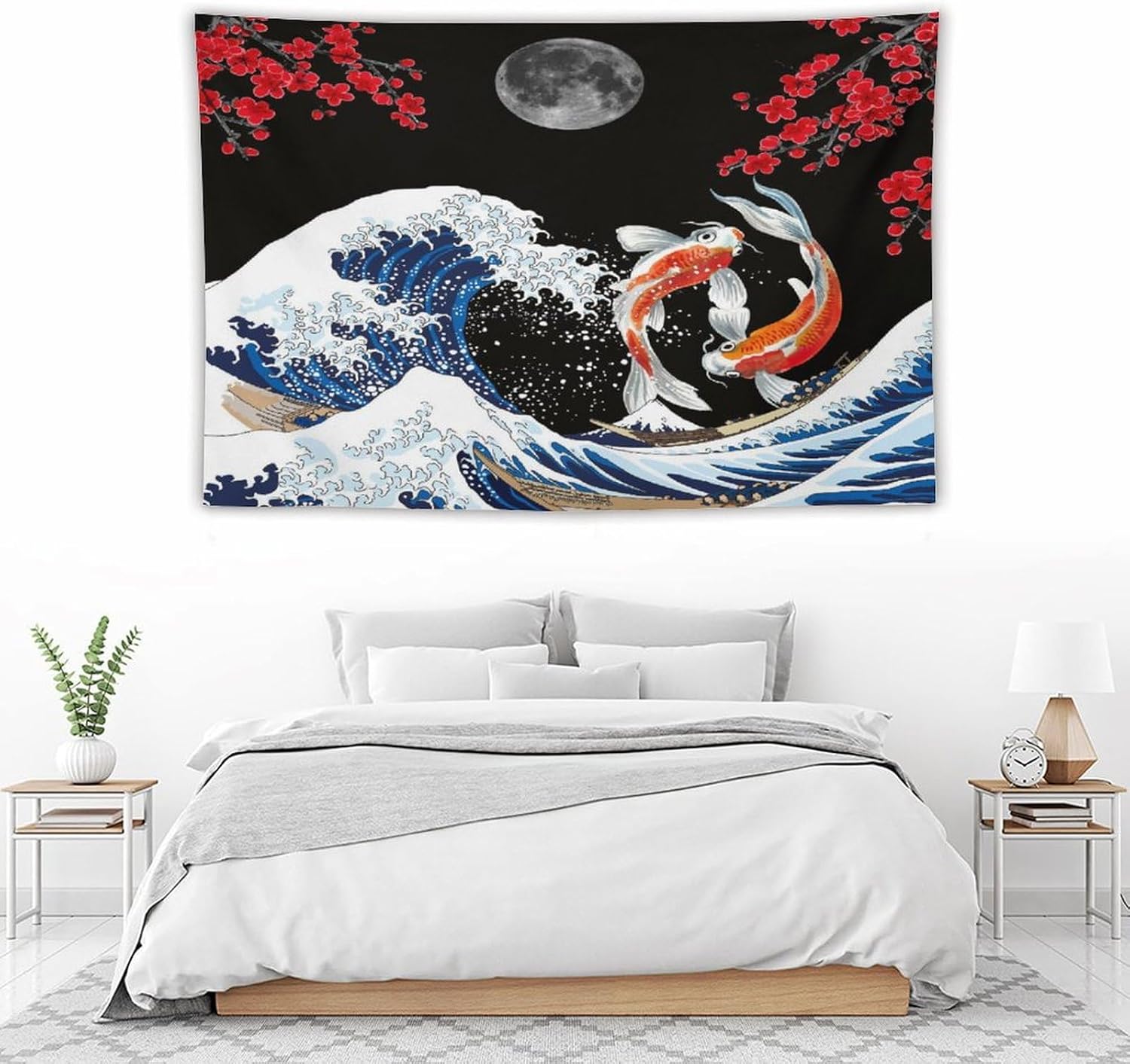 Houselerax Japanese Koi Fish Tapestry, Yin Yang Big Wave Red Cherry Blossom Tapestries Wall Hanging for Bedroom Living Room Office Decor 90"x60"