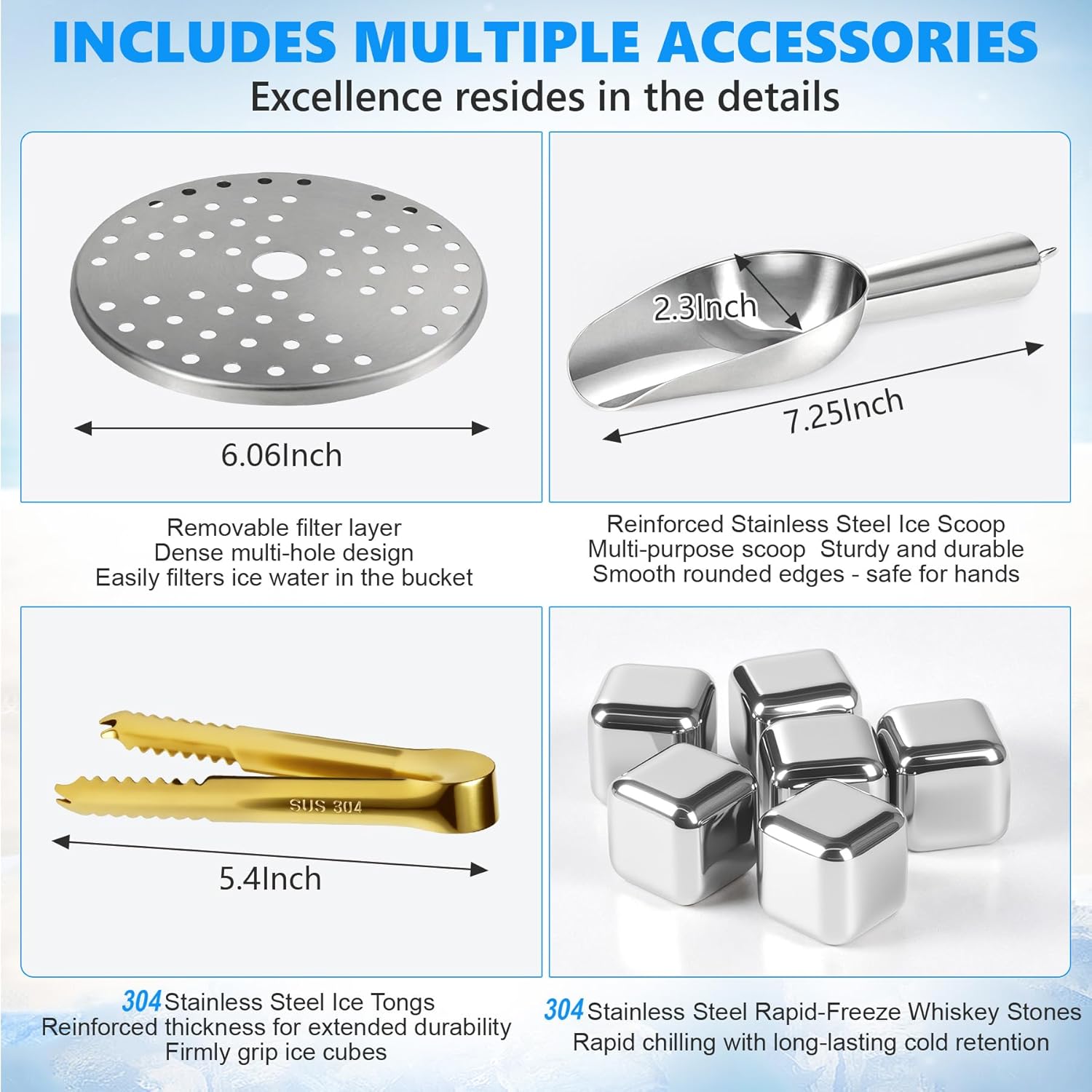 - 【MULTIPLE ACCESSORIES】Everything you need for chilling,ice bucket comes with an ice scoop,Ice Tongs,Removable filter layer,and even the Rapid-Freeze Whiskey Stones as you choose.