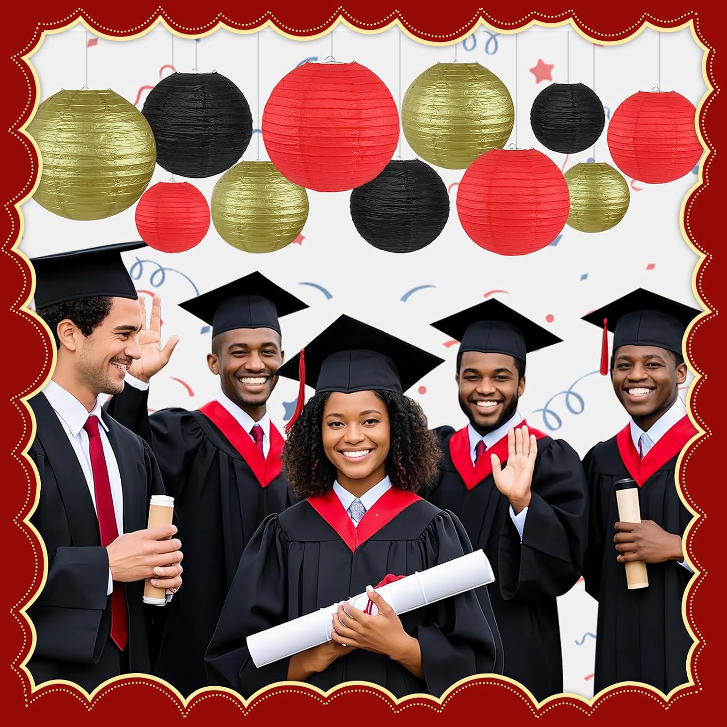 12Pcs Round Paper Lanterns Assorted Sizes (6" 8" 10" 12") for Home Decor, Wedding, Birthday, Hibachi Party, Casino Theme Party Decorations, Hanging Chinese Japanese Paper Lamps (Black Red Gold)