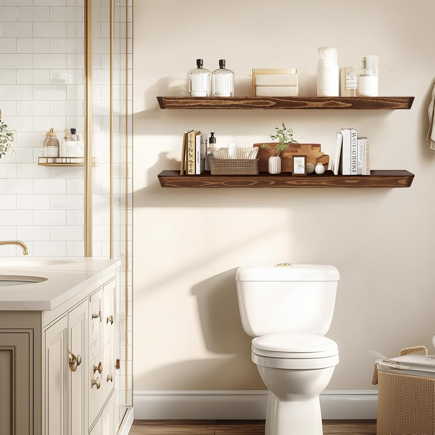 36"x6.8"x1.6" Slanted Floating Wall Shelves 2-Pack - Rustic Brown Finish, Heavy-Duty Solid Wood Design with Hidden Brackets - Perfect for Living Room, Kitchen, Bathroom, or Office