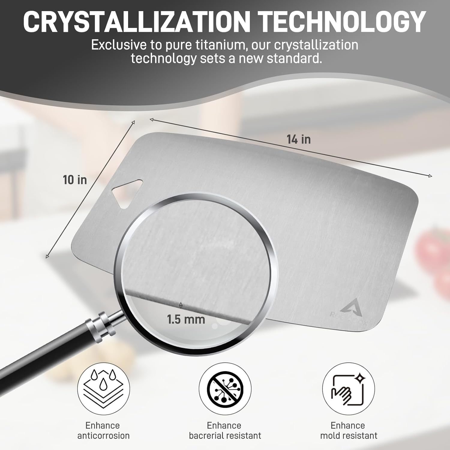 - DURABLE TITANIUM METAL: Crafted from 100% pure titanium, our chopping board will not warp, crack, or chip with heavy use in the kitchen, unlike plastic or wood cutting boards. The non-porous titanium metal also prevents staining.