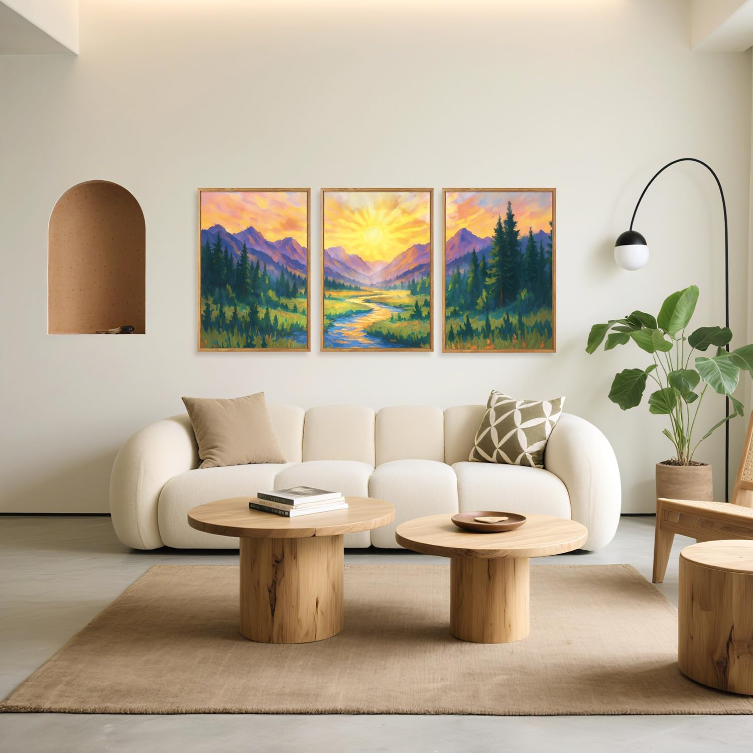 HPNIUB Vintage Mountain Framed Canvas Wall Art Set, Boho Sunrise Art Prints, Forest Nature Wilderness Art Paintings, Modern Farmhouse Pine Tree Wall Decor for Living Room Bedroom, Office- 16"x24"x3