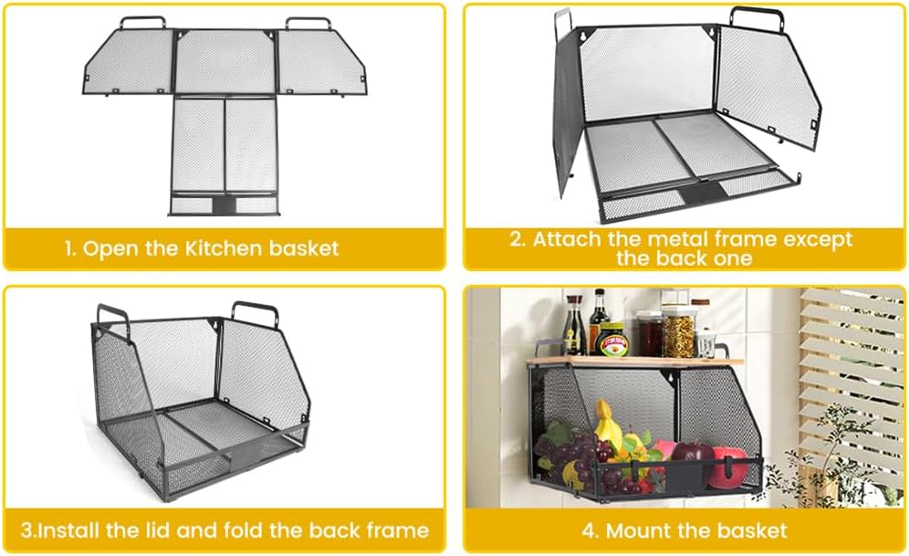1 SET Large fruit basket for kitchen counter-stackable basket with Bamboo Tops & Tag,hanging wall baske,for Cabinet Shelf Countertop pantry storaget, onion potato Vegs Bread Food Organizing Bin,BLACK