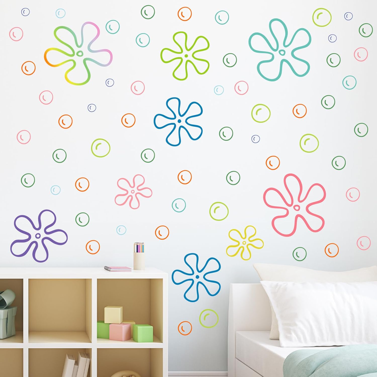- Package Included: 6 sheets bikini bottom theme wall stickers total of 187 PCS. Offer of patterns contain colorful flowers and cute bubbles. Decoration selection for bathroom, nursery, and birthday party.