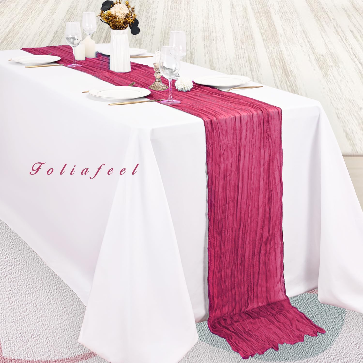 - Elegant Design: This cheese cloth runner is a perfect decorative element for dining tables and parties. Its pleated design makes it very elegant and romantic, flowing naturally on the table like water, making the dining table for weddings and parties look very beautiful. It can be paired with flowers and candlesticks, or tied with a bow to create various romantic feelings.