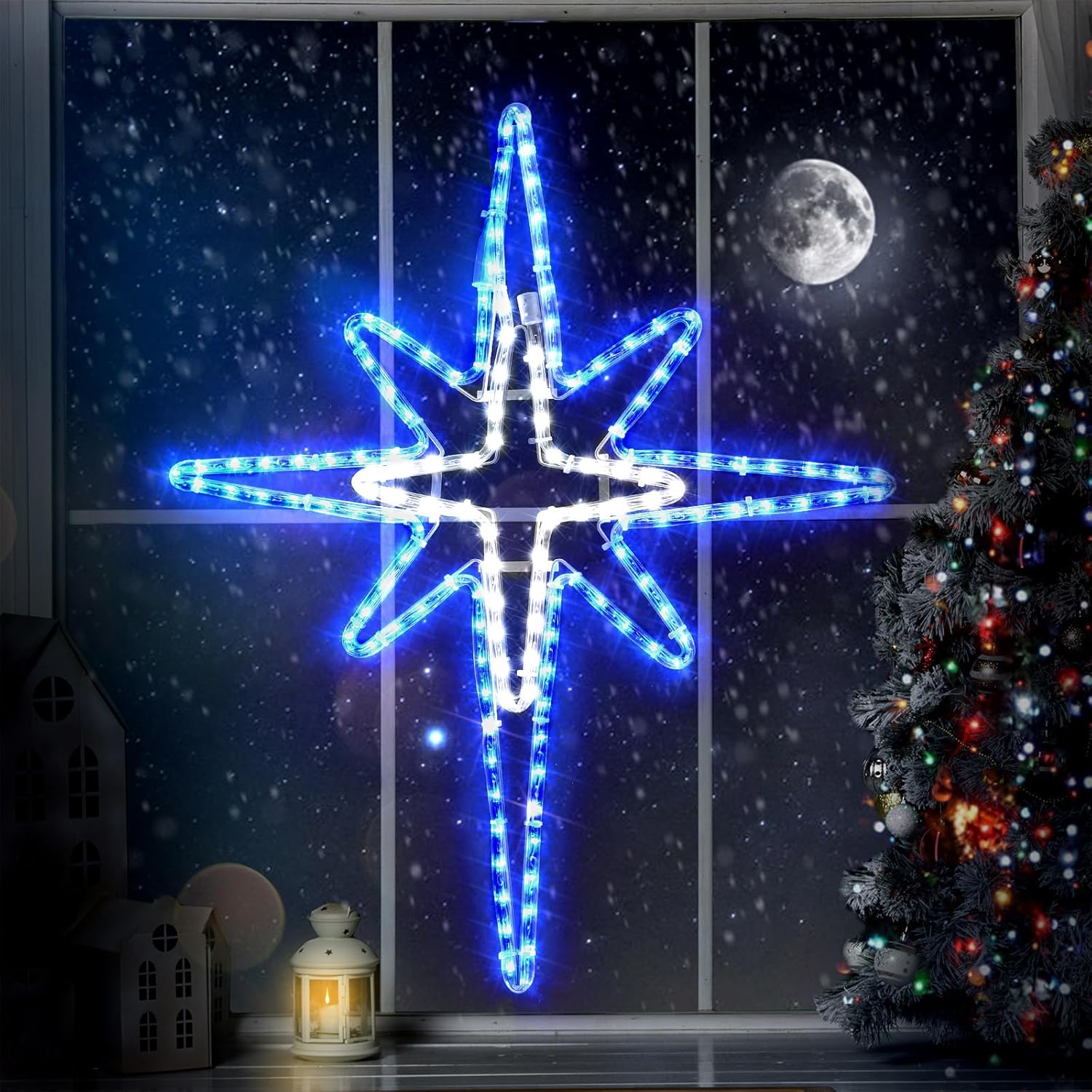 28" Christmas Star of Bethlehem LED Star Hanging Lights Nativity Holy Family Light for Door Window Porch Wall Decoration Plug Operated Lighted Hanging Tree Topper(Blue, White)