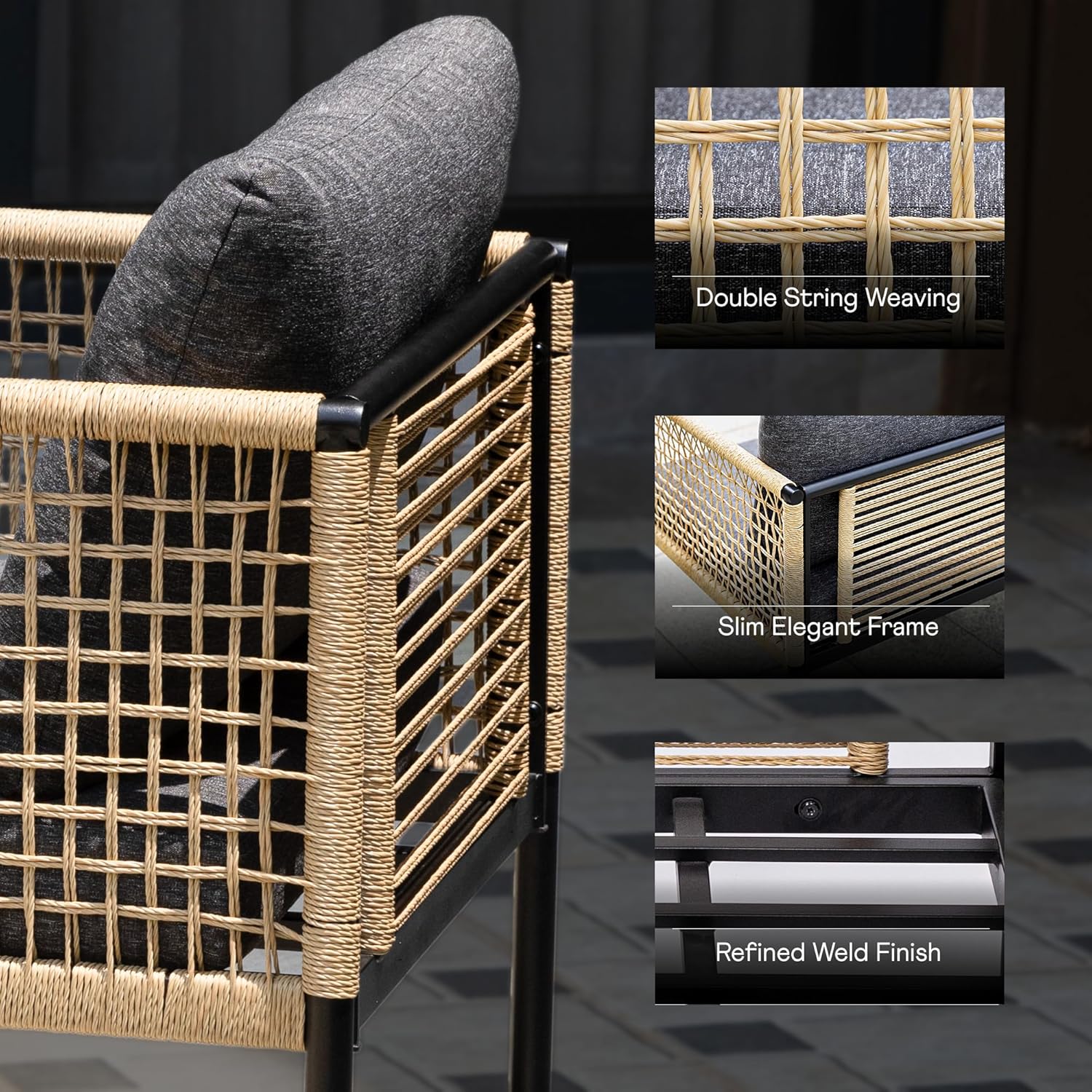 - WEATHER-RESISTANT ROPE WEAVE DESIGN: Featuring handwoven rope detailing on the armrests; these chairs give a stylish touch while offering durability; the weather-resistant rope is UV-tested to prevent fading and wear from sun exposure and rain