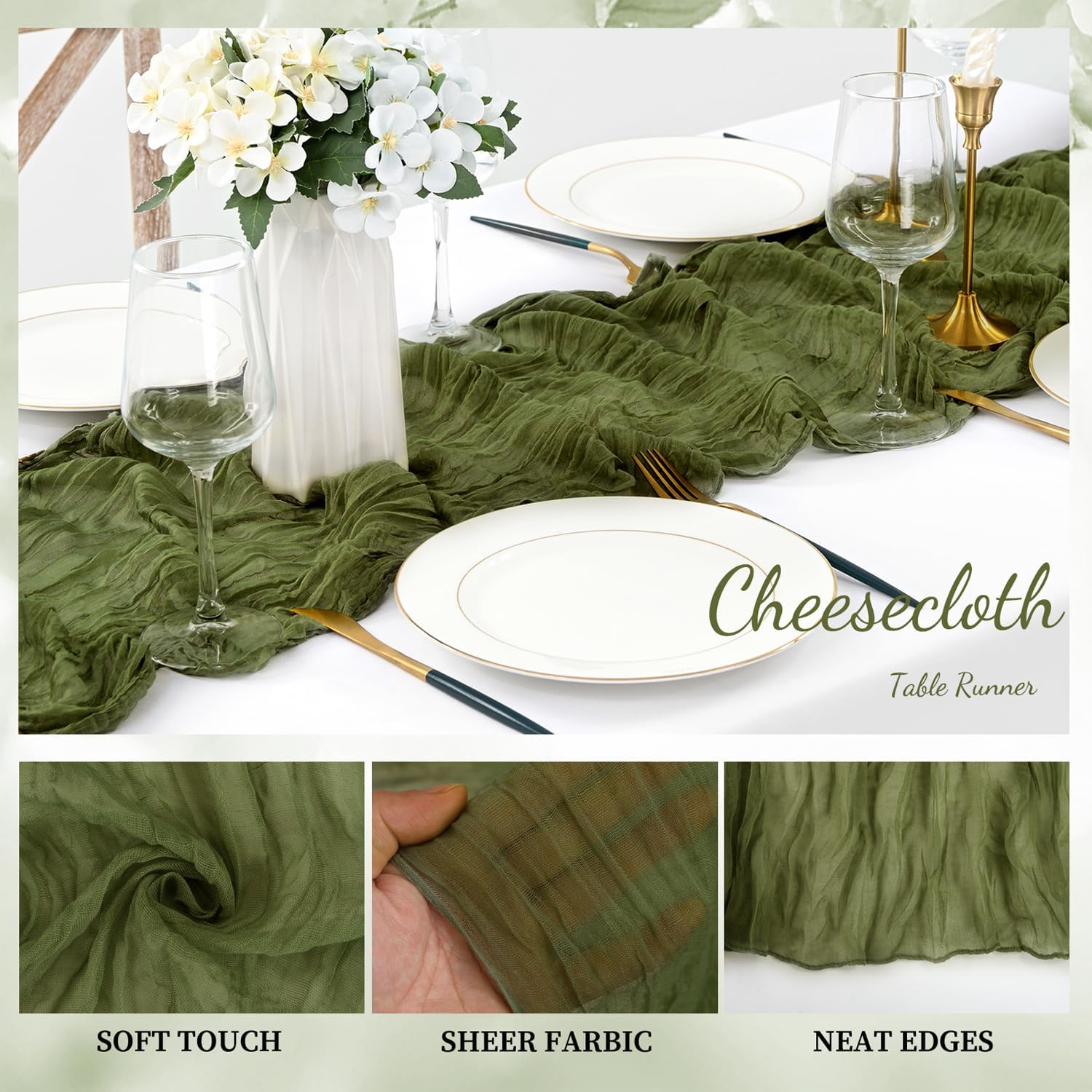 - Cheesecloth Table Runner Size: You will receive 20 olive green cheesecloth tablerunner, each measuring 20 x 120 inches. The quantity is sufficient for you to decorate various romantic occasions. It can decorate most shaped tables, such as rectangular tables, round tables, and cocktail tables. It is long enough to decorate a large table and be placed perfectly and elegantly on the tabletop, adding a romantic atmosphere to your occasion.