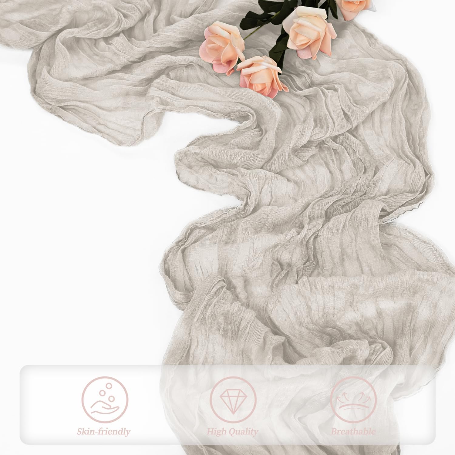 - Elegant Design: This cheese cloth runner is a perfect decorative element for dining tables and parties. Its pleated design makes it very elegant and romantic, flowing naturally on the table like water, making the dining table for weddings and parties look very beautiful. It can be paired with flowers and candlesticks, or tied with a bow to create various romantic feelings.