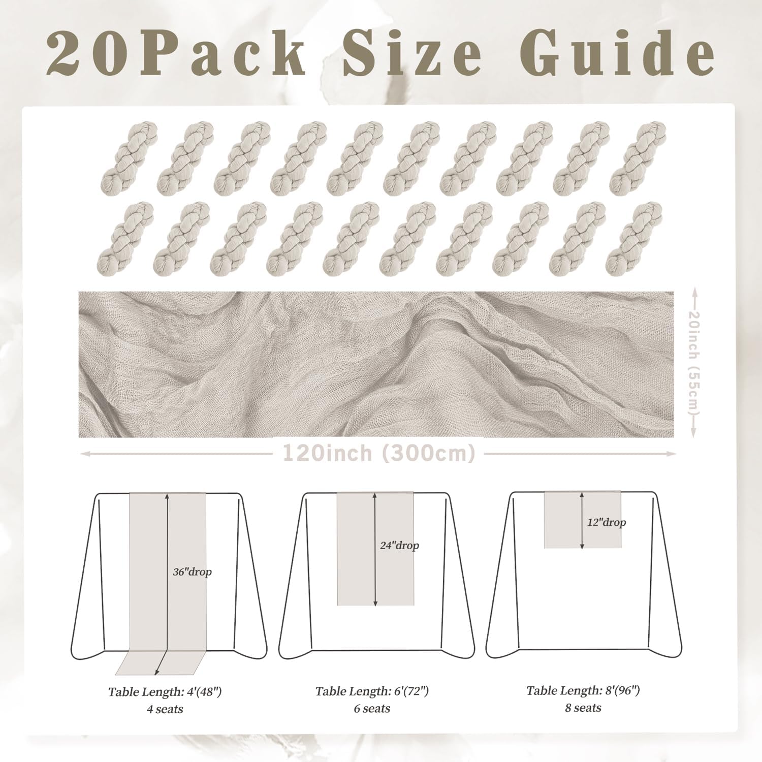 - Cheesecloth Table Runner Size: You will receive 20 rose brown cheesecloth tablerunner, each measuring 20 x 120 inches. The quantity is sufficient for you to decorate various romantic occasions. It can decorate most shaped tables, such as rectangular tables, round tables, and cocktail tables. It is long enough to decorate a large table and be placed perfectly and elegantly on the tabletop, adding a romantic atmosphere to your occasion.