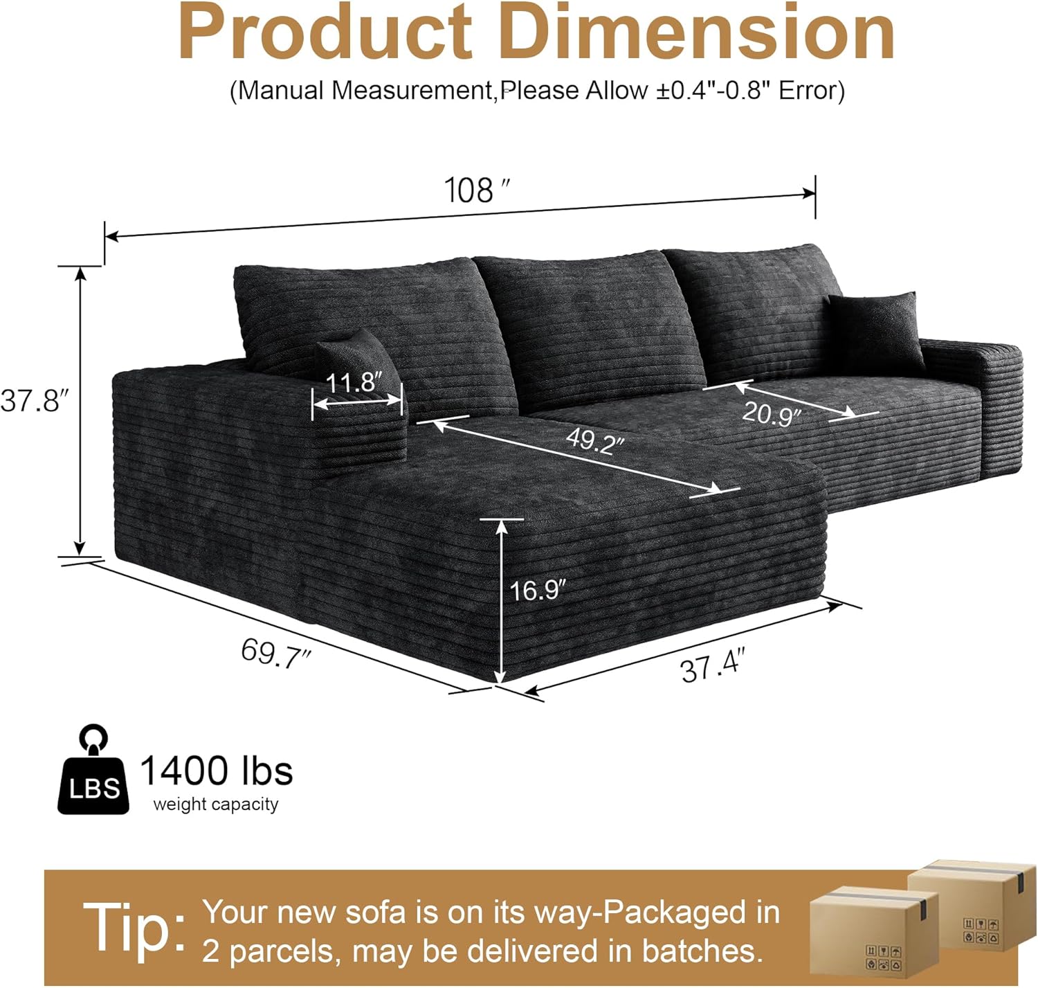 108" Sectional Couches for Living Room Modern Modular Sofa with L-Shape Couchs Upholstered Boneless Couch Deep Seat Sectional Couch with Chaise (Black, Left Facing Chaise+2Seaters)