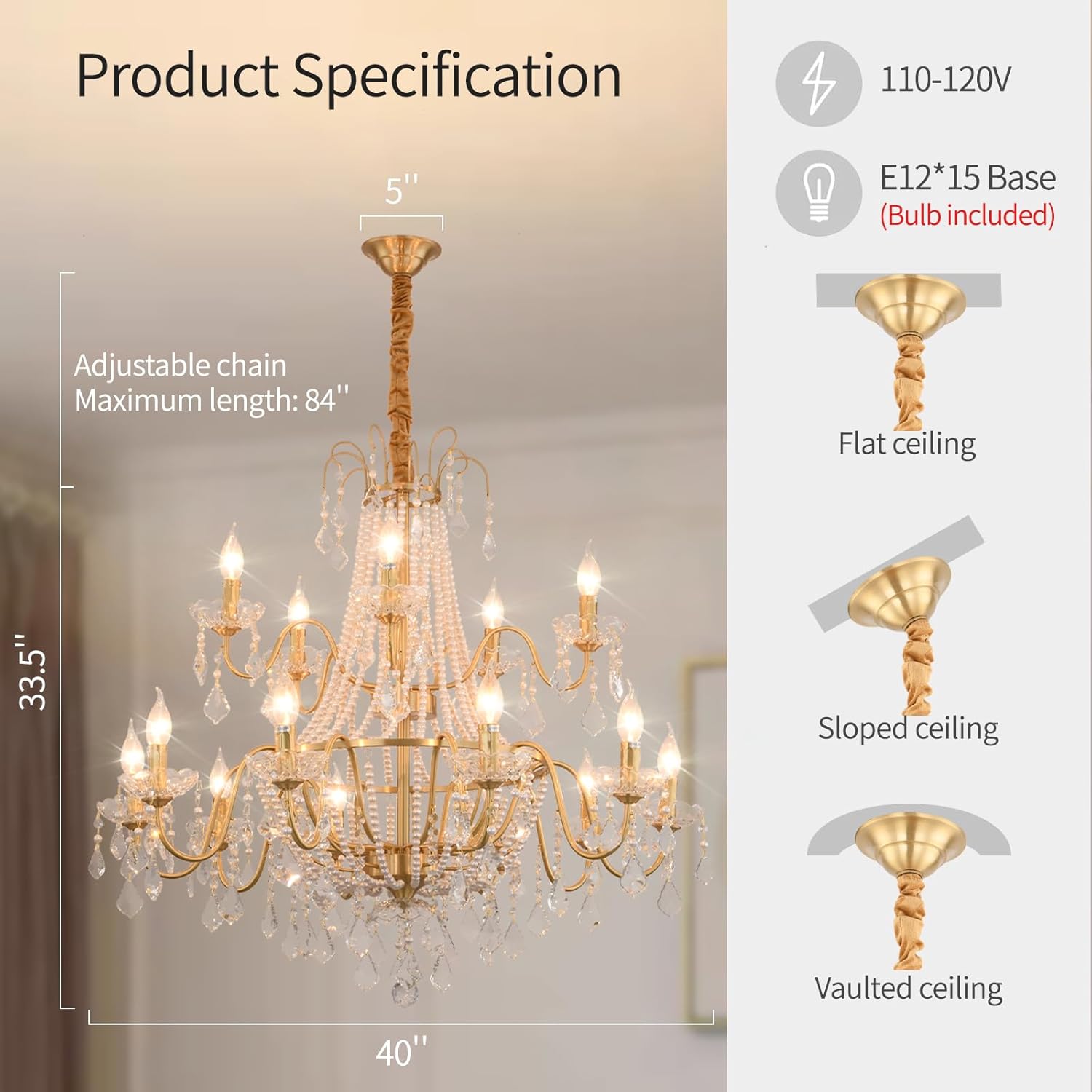 40" Large Brass Crystal Chandeliers,Gold Brushed Brass Chandelier for High Ceiling Living Room Dining Room Staircase Hallway Entryway Foyer(15-Light, Bulb Included)