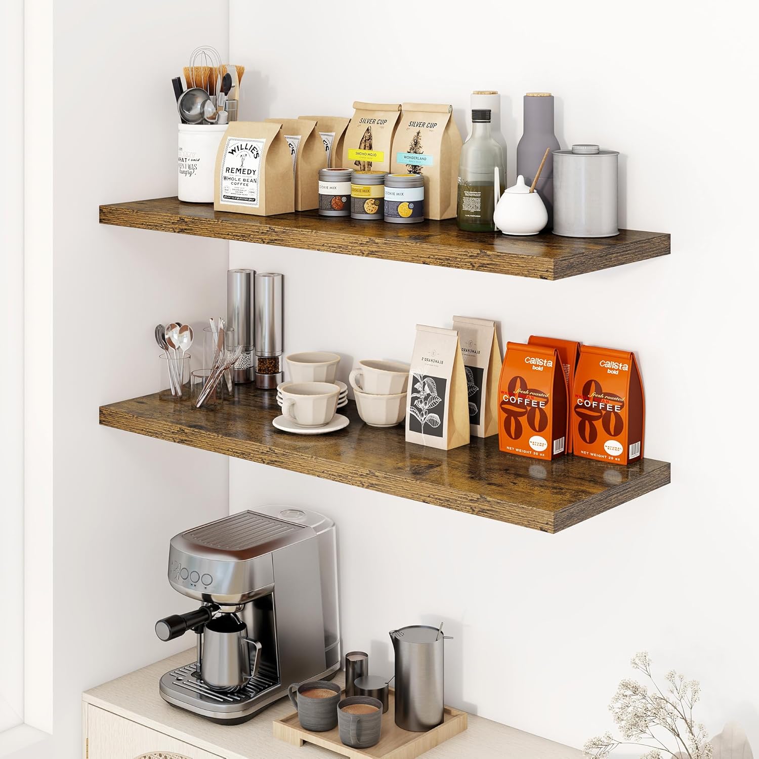 40" Floating Shelves for Wall, 12" Deep Slim Rustic Brown Floating Shelves, Wall-Mounted Shelves for Bedroom, Living Room, Kitchen, Bathroom - Set of 2