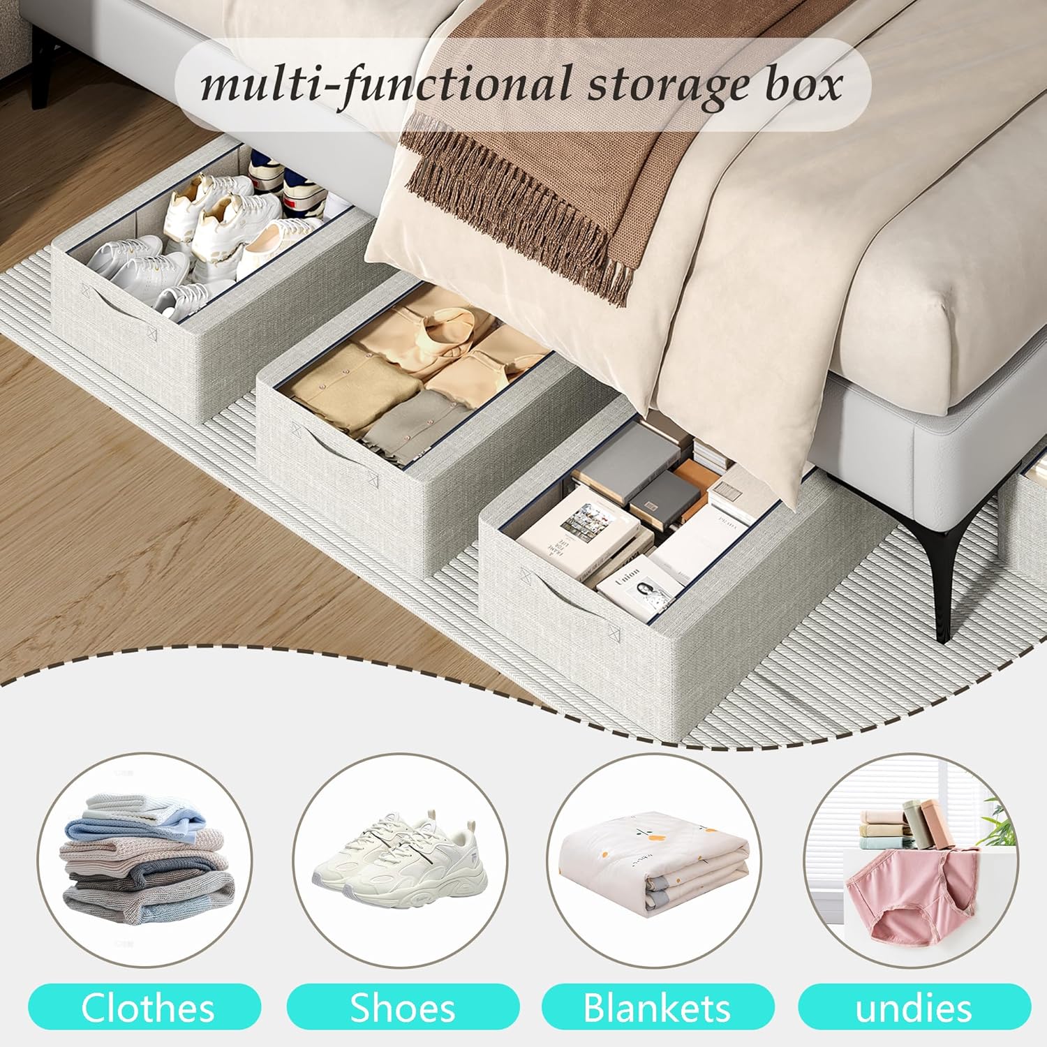 3PCS Under Bed Storage Bins with Metal Frame, Linen Fabric Frame Storage Box Clothes Organizer Bins, Underbed Container with Clear Window (Beige, 23.6 x 13 x 6IN)
