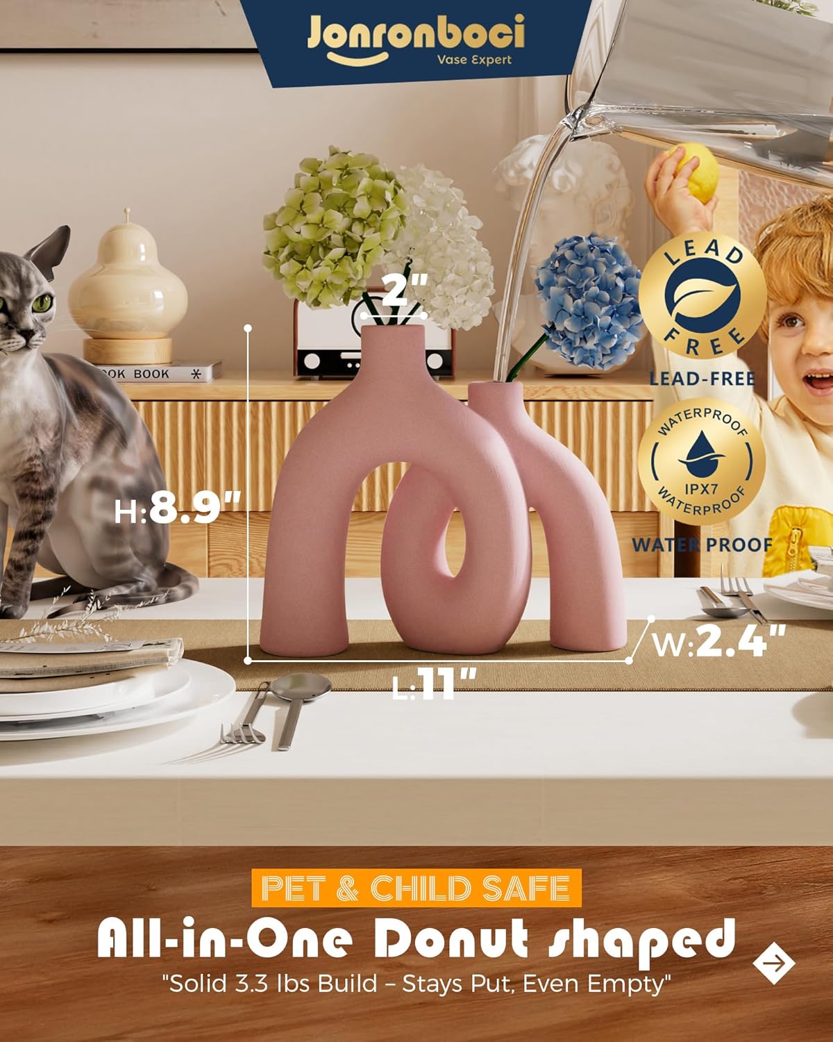 - Size - This set includes one matte light pink handmade vases. Conjoined Size W 10" X , H Small: 7.3" and Large 8.9", with a vase neck of 1.5". Both vases feature a modern glam eclectic style.
