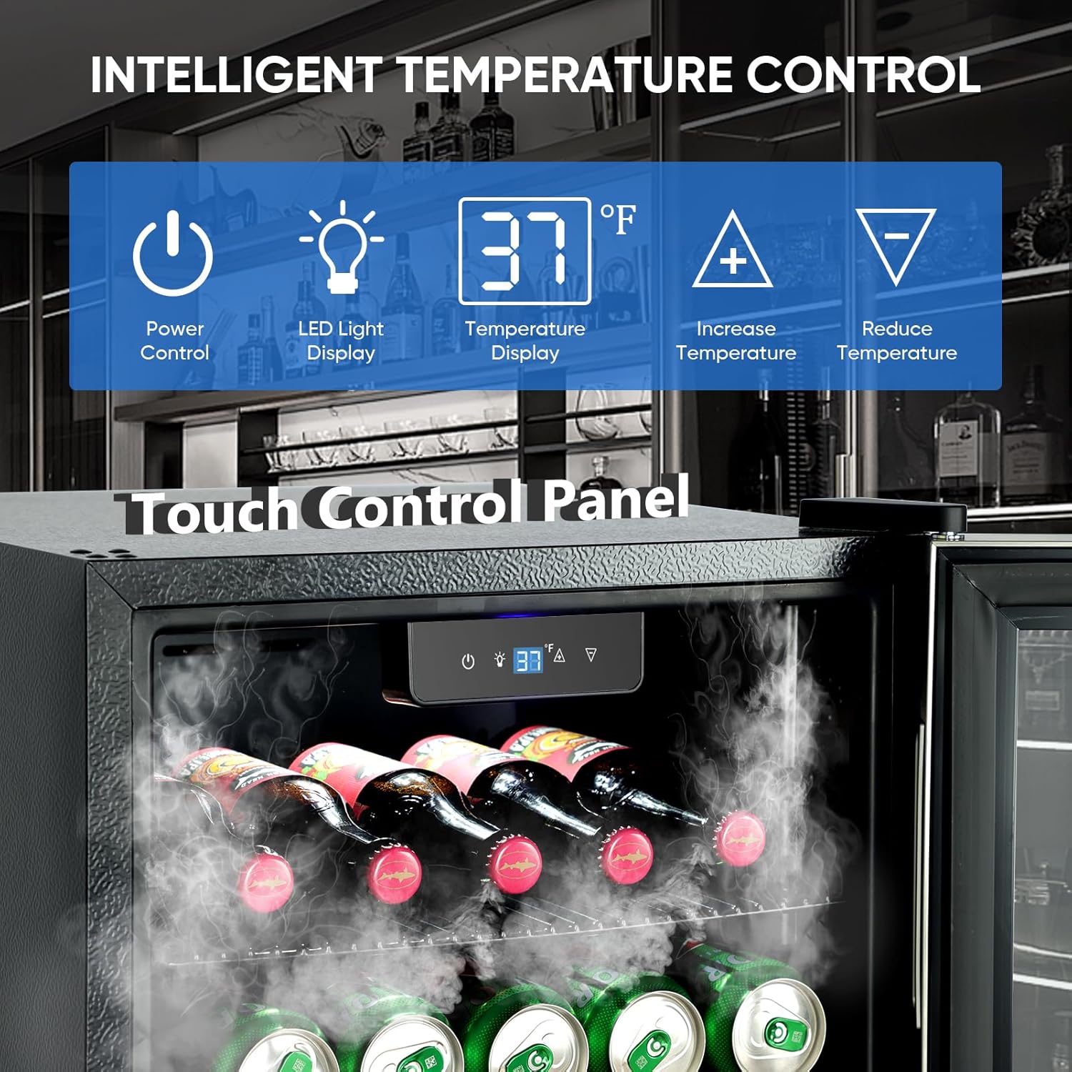 - INTELLIGENT COOLING WITH EVERY SIP - The drink fridge's smart control panel makes it easy to take control of your beverage storage. Bright LED lights make operation a breeze, even in the dimmest of rooms. You can easily adjust the temperature range from 37°F to 64°F, giving you the flexibility to store different types of beverages at the ideal temperature. Whether it's wine, a variety of sodas or a cold beer, it provides the ideal temperature. It is dedicated to creating the perfect drinking environment for you, making every sip full of pleasure