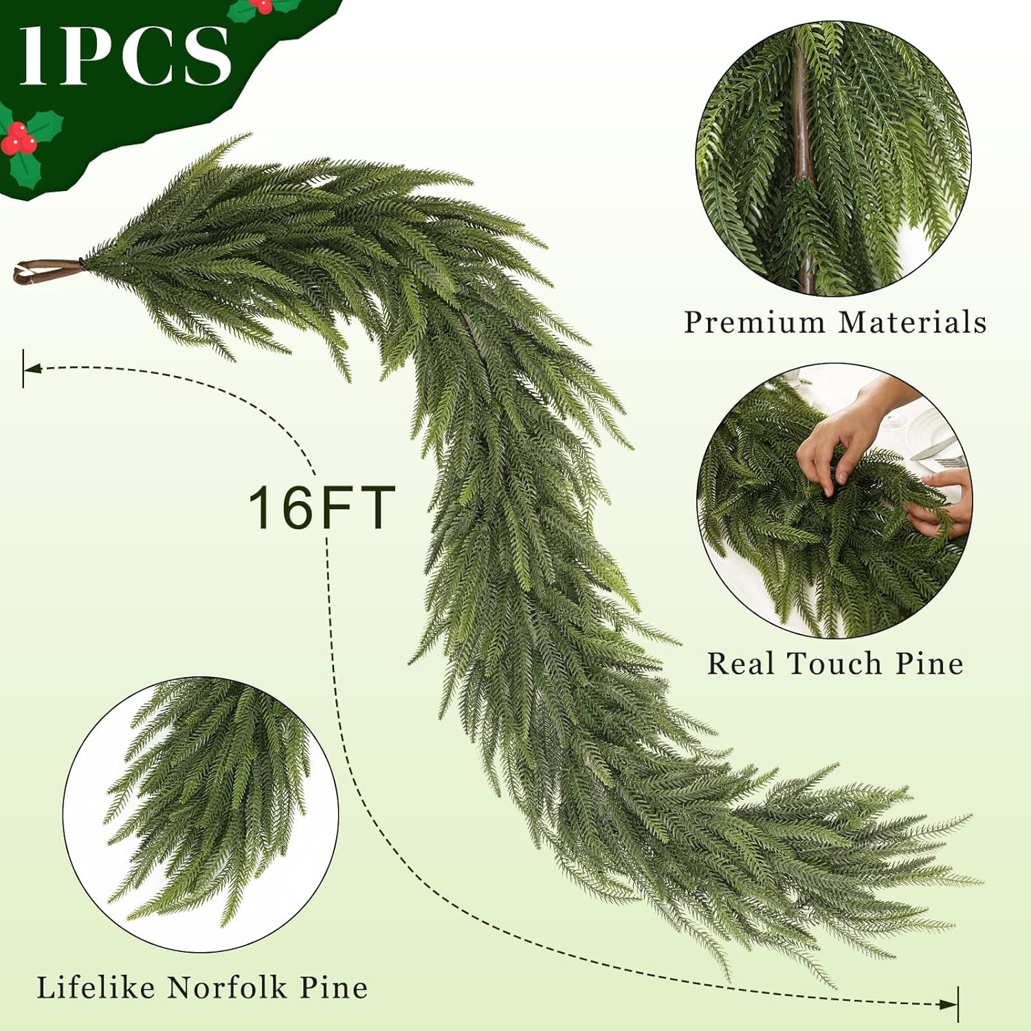 16FT Christmas Norfolk Pine Garland -1PCS, Artificial Pine Needles Garlands Faux Greenery Fake Garland for Holiday Fireplace,Table,Window,Stairs,Mante,Indoor Outdoor Decor