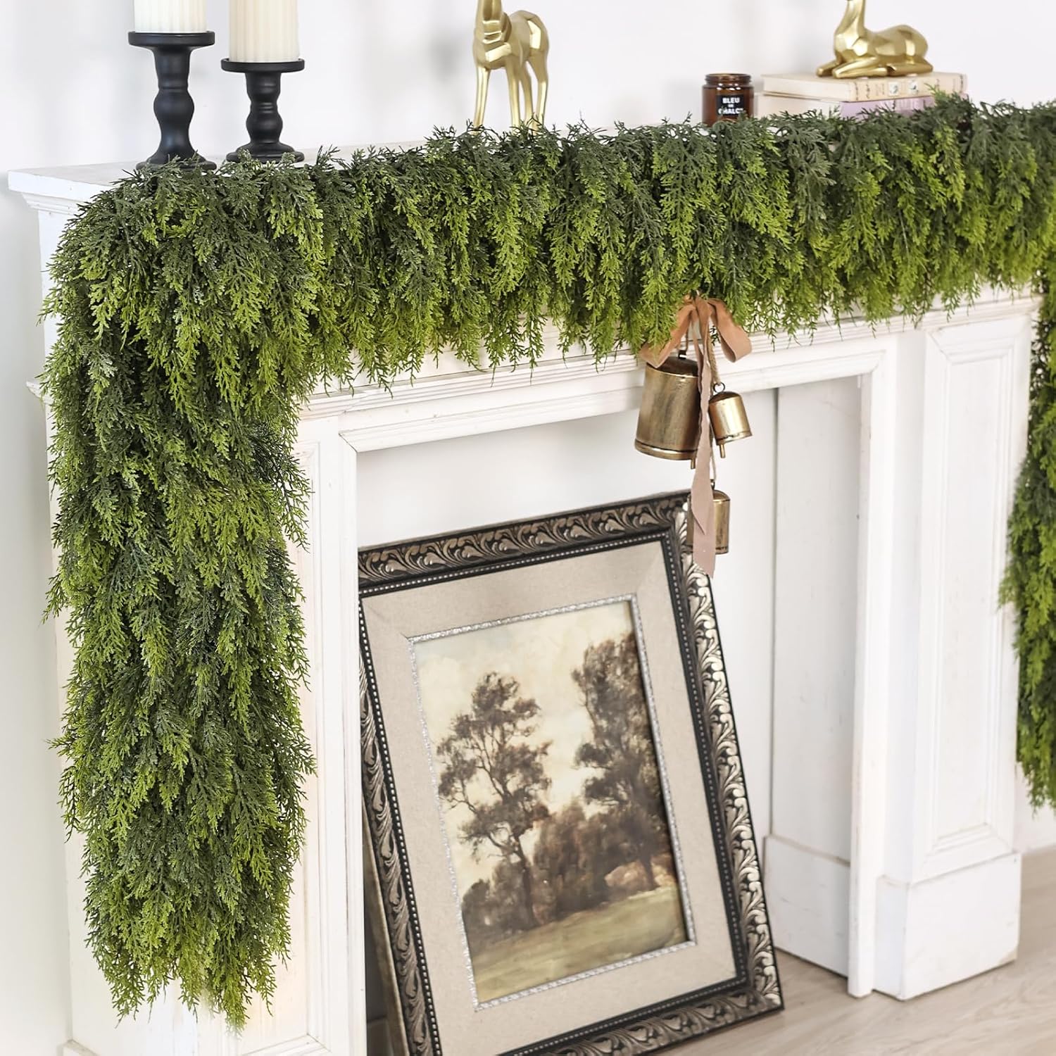 - [Lifelike Christmas Garland]: This cedar has very lush garland and and the quantities of its leaves is twice that of ordinary garlands, compared to other garland, it is fuller, more layered, and more realistic. Real touch ,and perfectly restoring the appearance of real cedar, it is the perfect Christmas decoration.