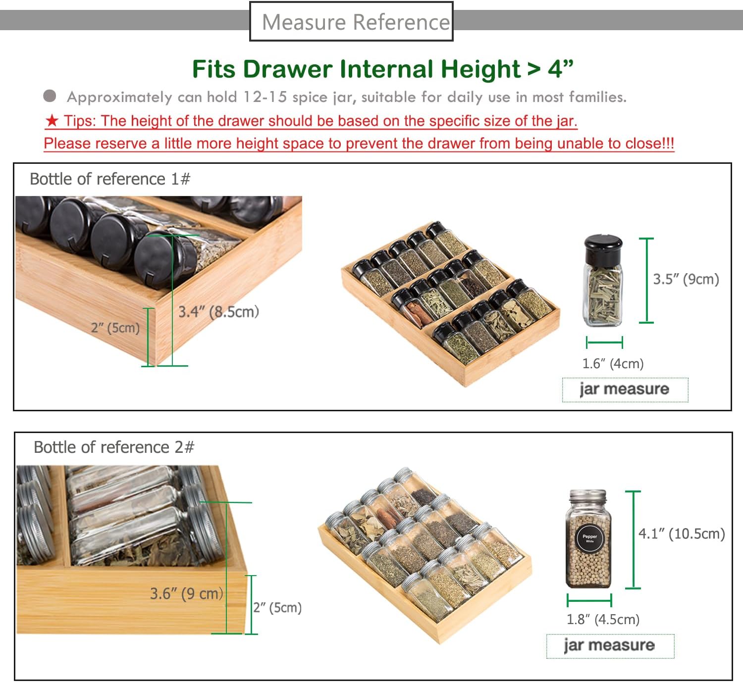 - 【Measure】Height 2" (5cm), Length 9.7" (24.5cm), Depth 15" (38cm). Package: 1 Pack/Box (spice jar is NOT include). [ IMPORTANT!!! ] Measuring the internal size of the drawer, please avoid structure such as the handle screw. Due to the difference in jars, please reserve a little more height space to prevent the drawer from being unable to close. Please refer to the picture for the reference size of the jar. To avoid return, please check the size carefully! Highly recommended!