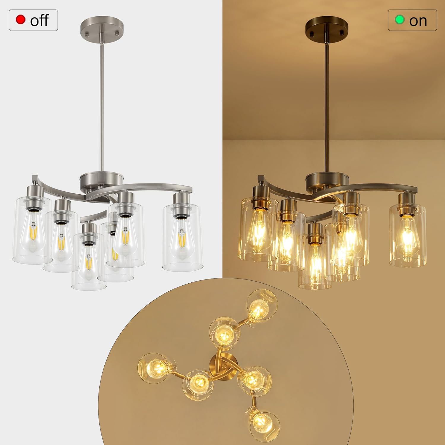 - 💡 Flexible Combination of Diverse Light Sources:Farmhouse lighting fixtures ceiling brushed nickel is equipped with six E26 standard lamp sockets, compatible with incandescent bulbs, LED bulbs, CFL bulbs, and halogen bulbs (bulbs not included), and supports dimming functionality (requires dimmable bulbs and switches). The lighting ambiance can be freely adjusted from warm and comfortable to bright and white, meeting the needs of different scenarios.