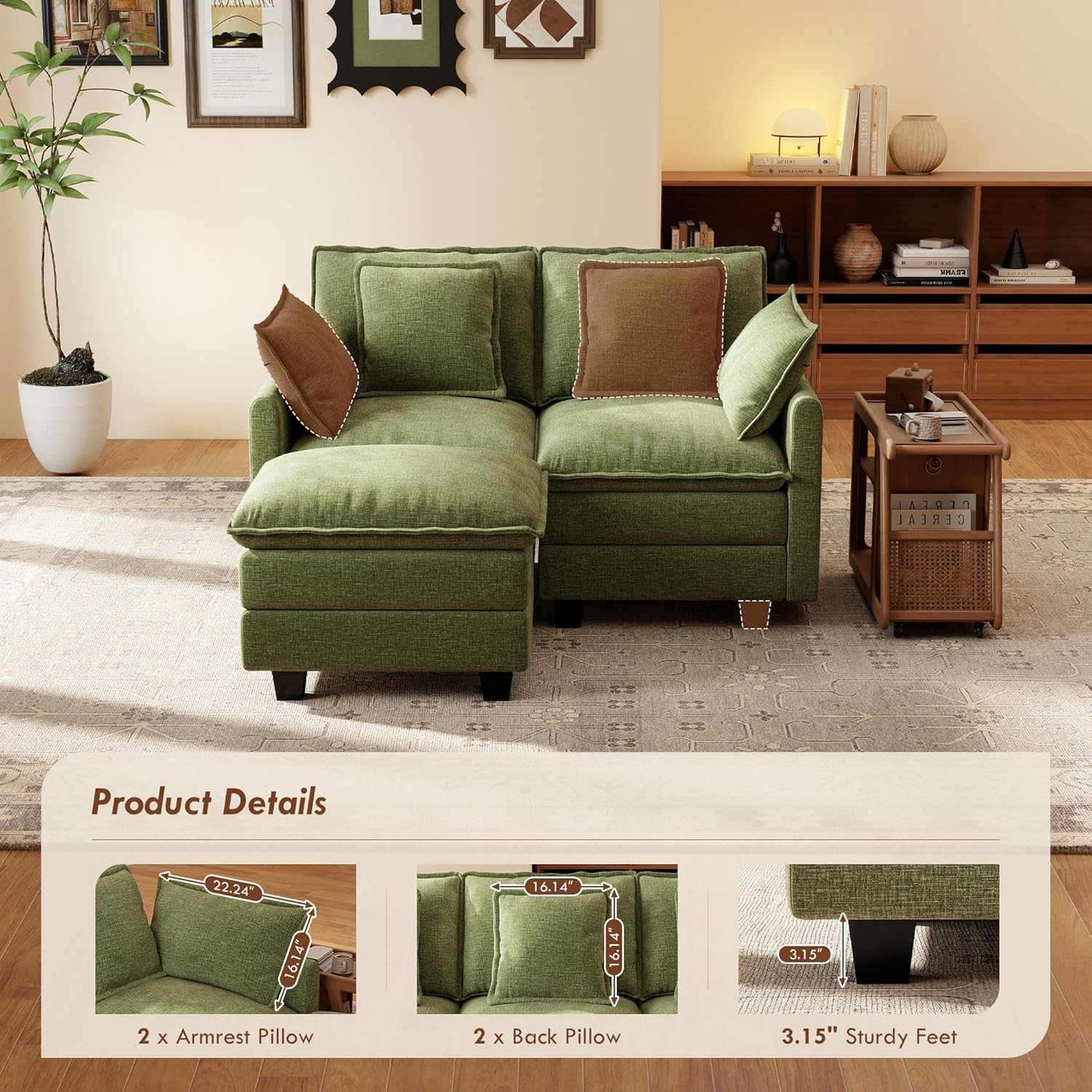Ihanherry 57" L Shaped Modular Sectional Cloud Sofa, Modern 3 Seat Chenille Couch with Ottoman for Living Room, Bedroom and Apartment, Green