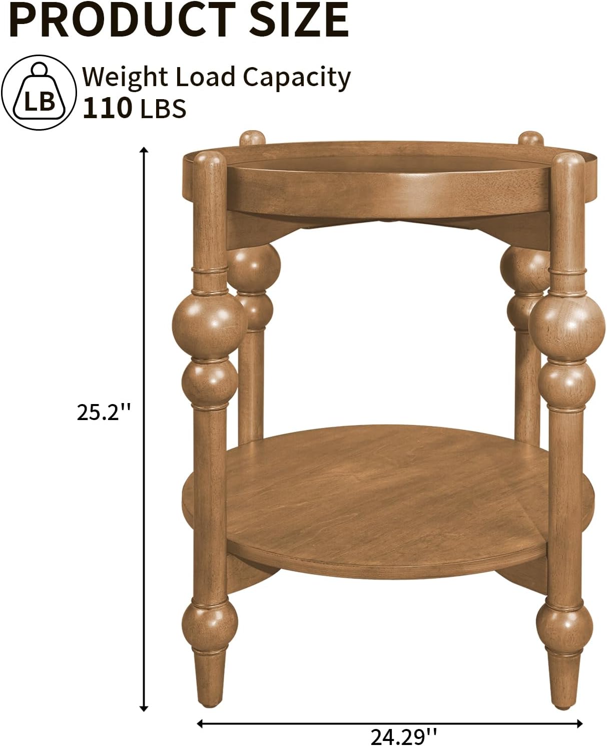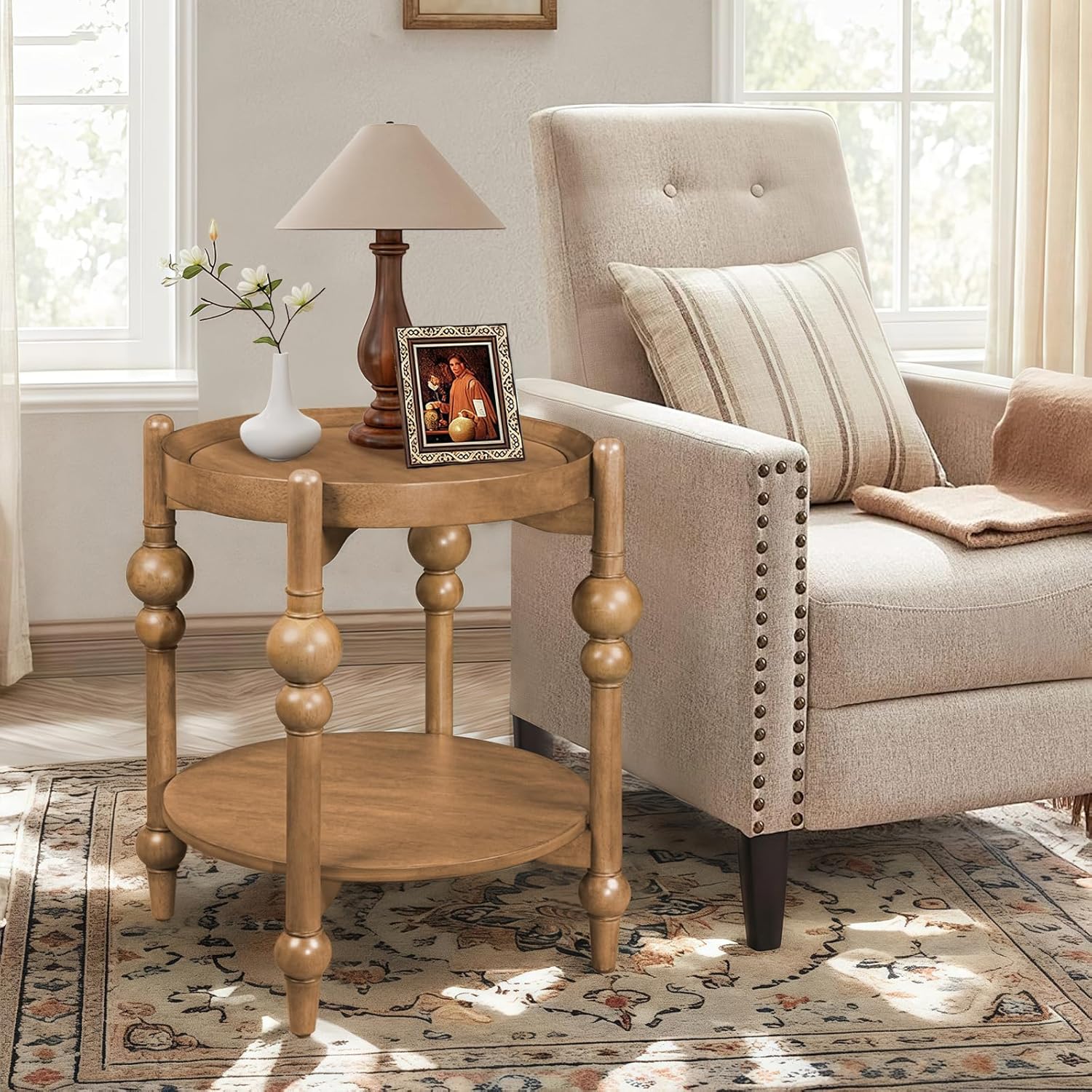 - Durability Build for Daily Use: The round side table use all-solid wood legs and reinforced crossbars ensure exceptional stability and weight-bearing capacity. The smooth real wood veneer tabletop and shelf maintain a natural wood grain finish for easy cleaning and long-lasting beauty